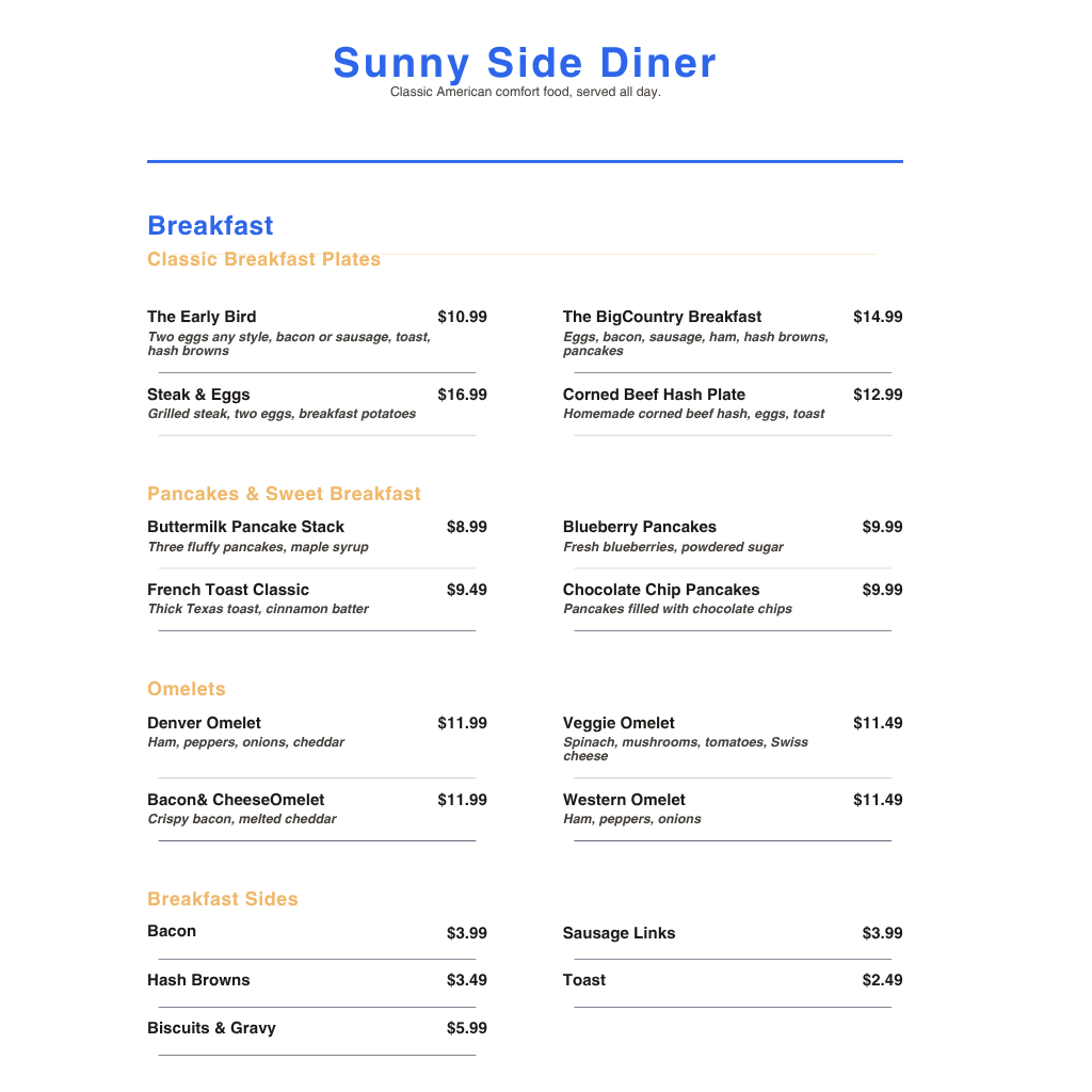 A practical, readable menu on your website should include section headings, item names, brief descriptions where helpful, and current prices. That combination gives both customers and Google what they need to understand what you serve and whether it matches what they are looking for.