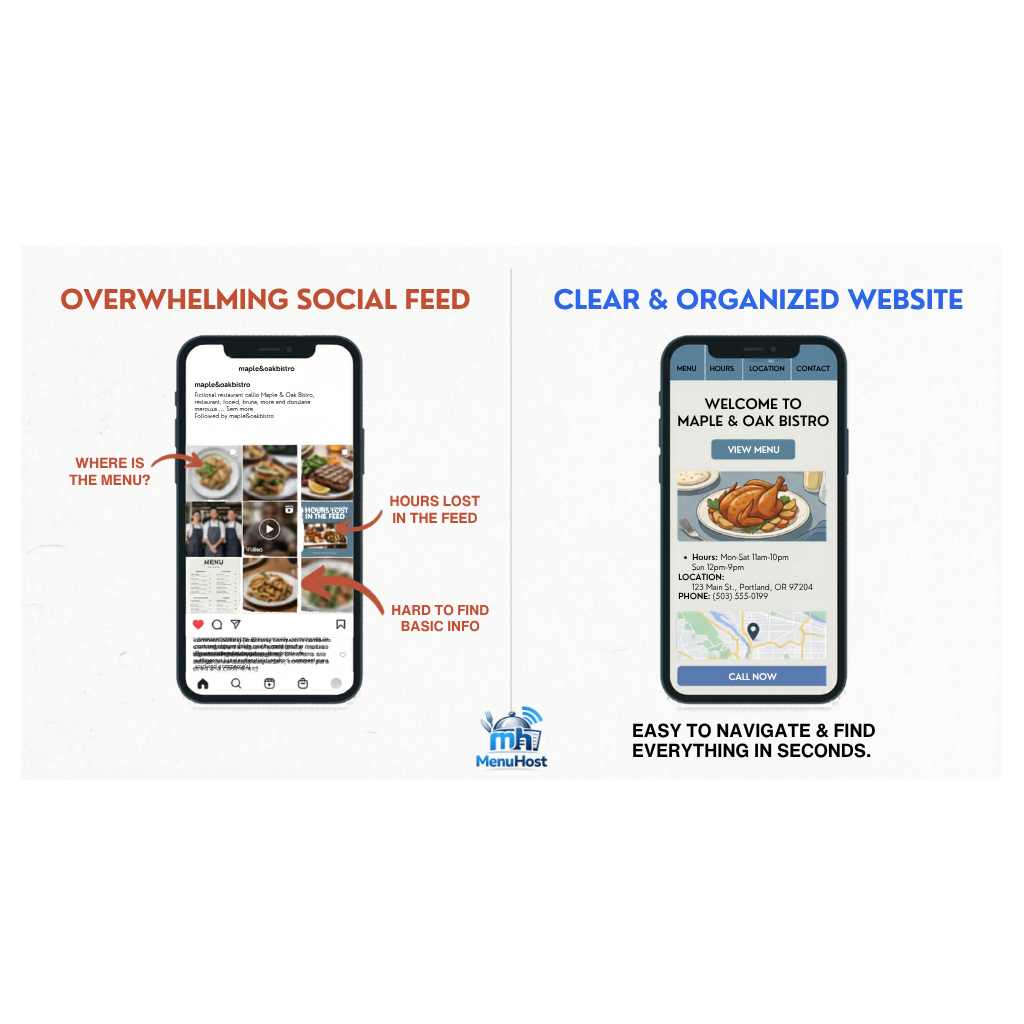 A Facebook page can still support your business, but it often puts important information behind too many clicks, mixes business details with casual posts, and does not give your restaurant the same kind of clear, organized online presence that a website does.